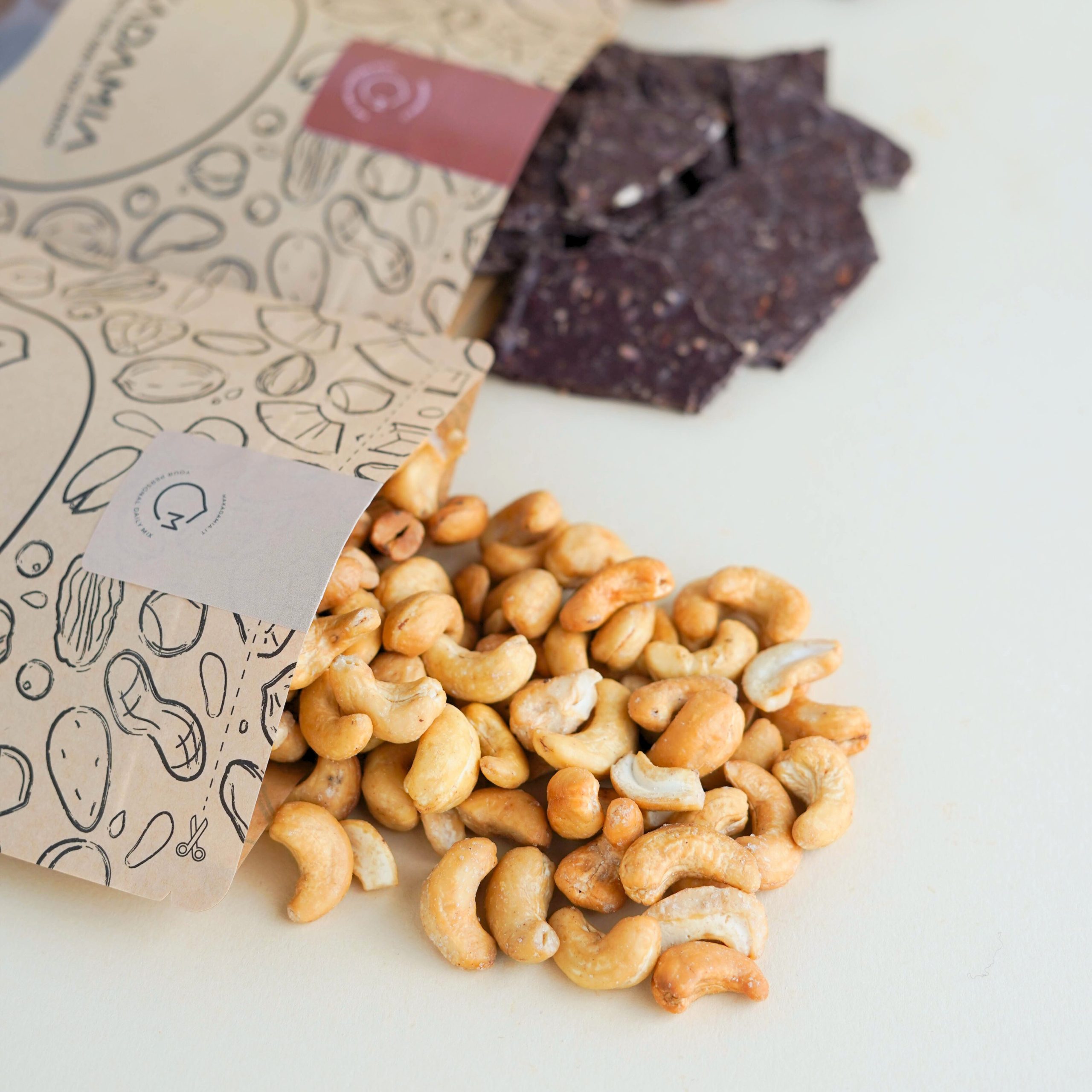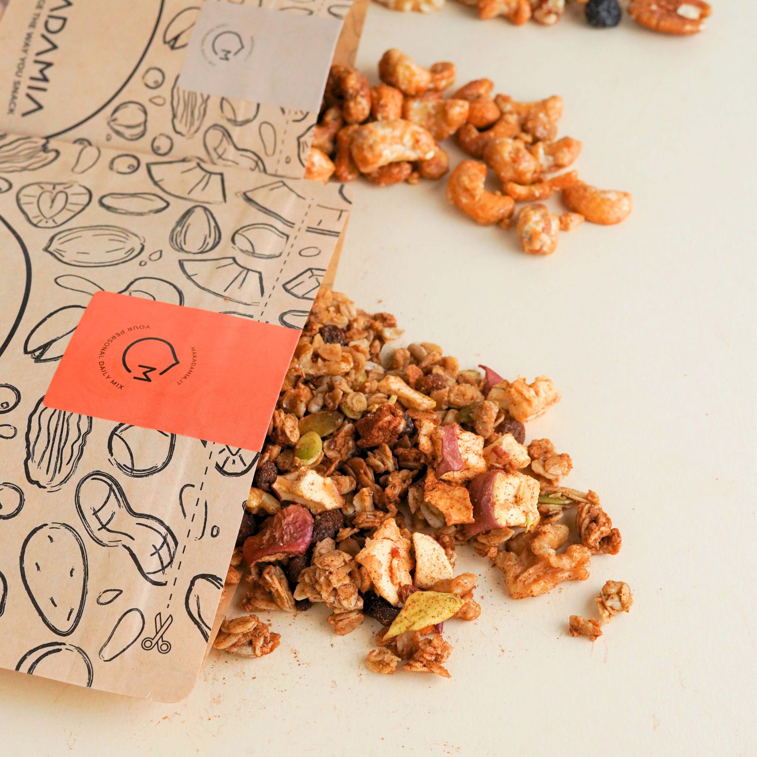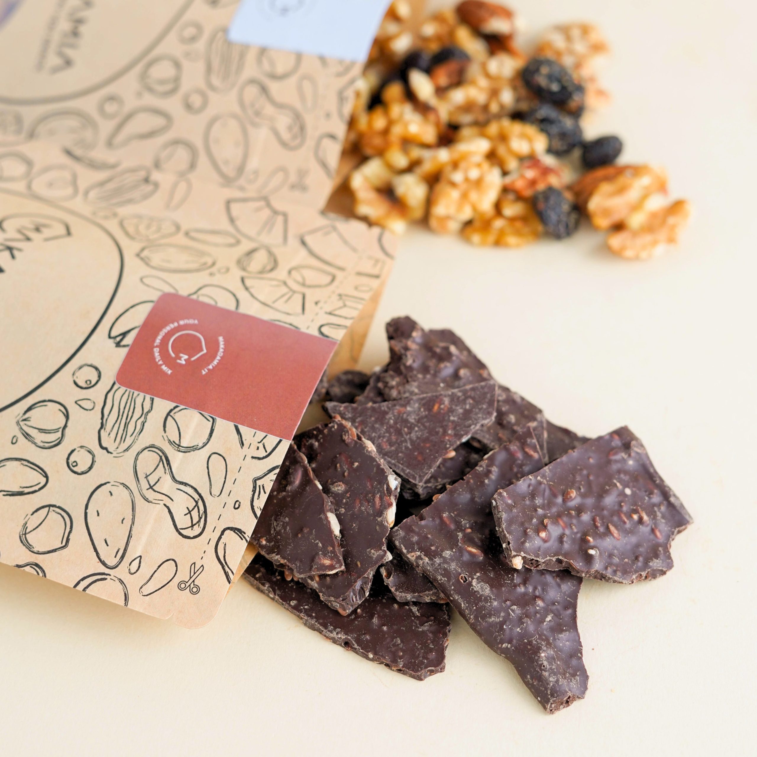 Tutto arriva a casa tua in un pack 100% compostabile, con la possibilità di aggiungere il Maka-Tool, il nostro porta-snack riutilizzabile che ti segue ovunque.