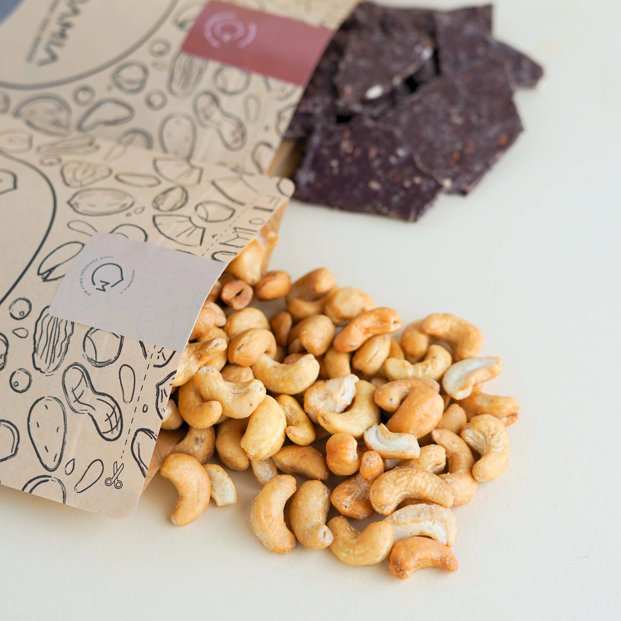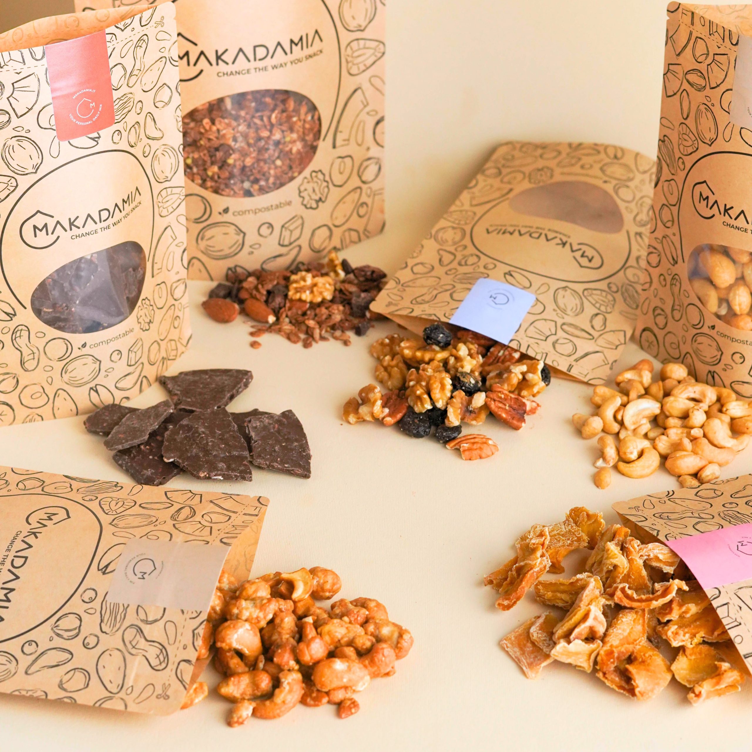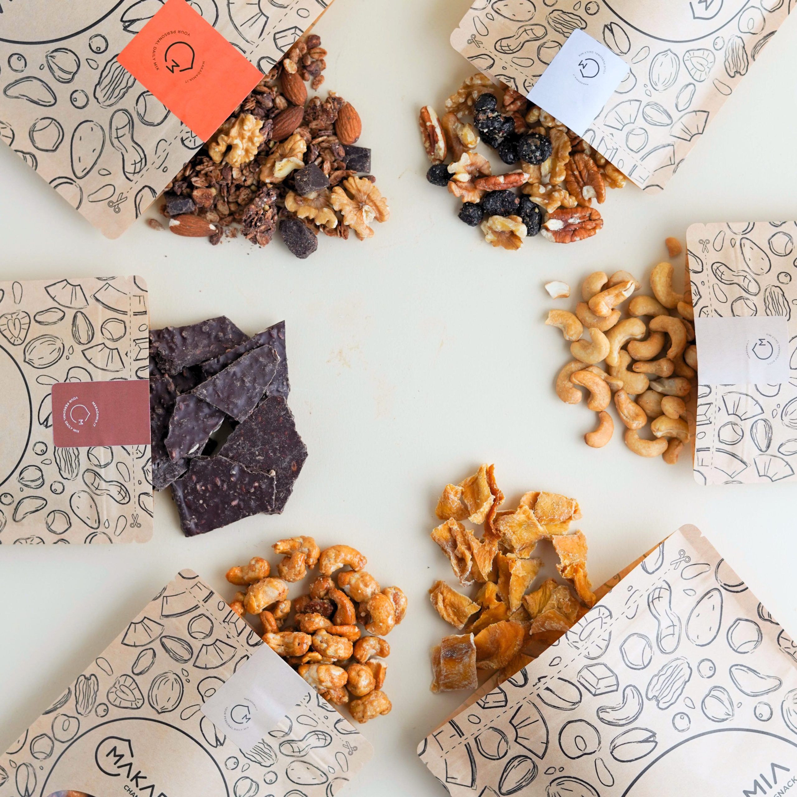 Tutto arriva a casa tua in un pack 100% compostabile, con la possibilità di aggiungere il Maka-Tool, il nostro porta-snack riutilizzabile che ti segue ovunque.
