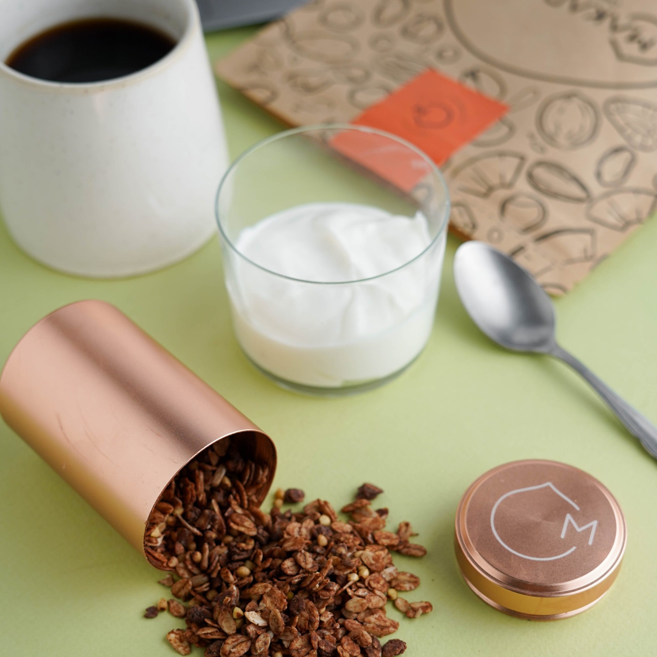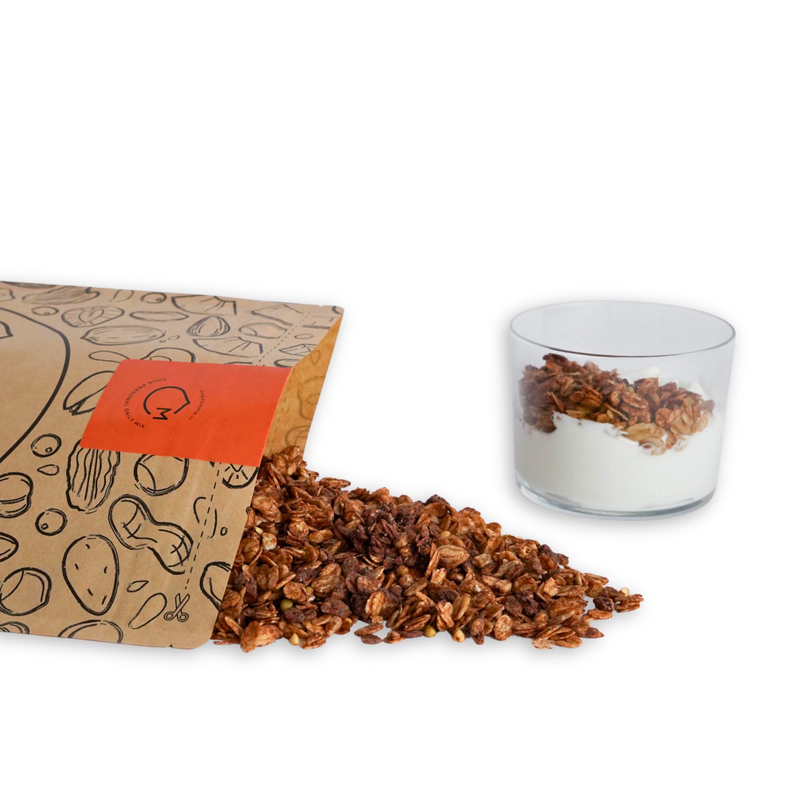 La Granola al Cioccolato nasce per questo: intensa, golosa e piena di carattere, ma sempre fatta con equilibrio e ingredienti scelti con cura. È quella granola che ti mette subito nel mood giusto, senza complicazioni: apri la confezione, senti l’aroma… e hai già voglia di affondare il cucchiaio.