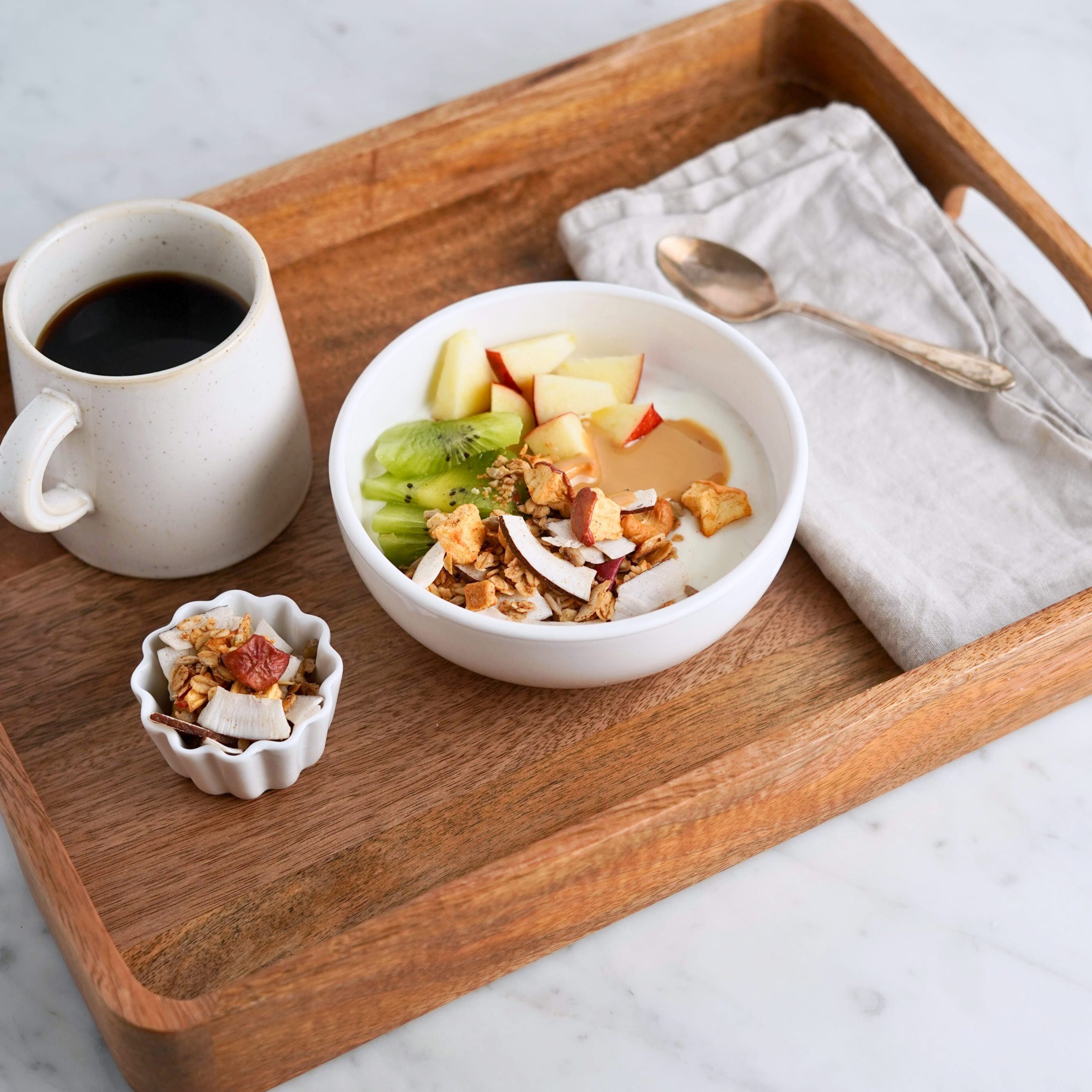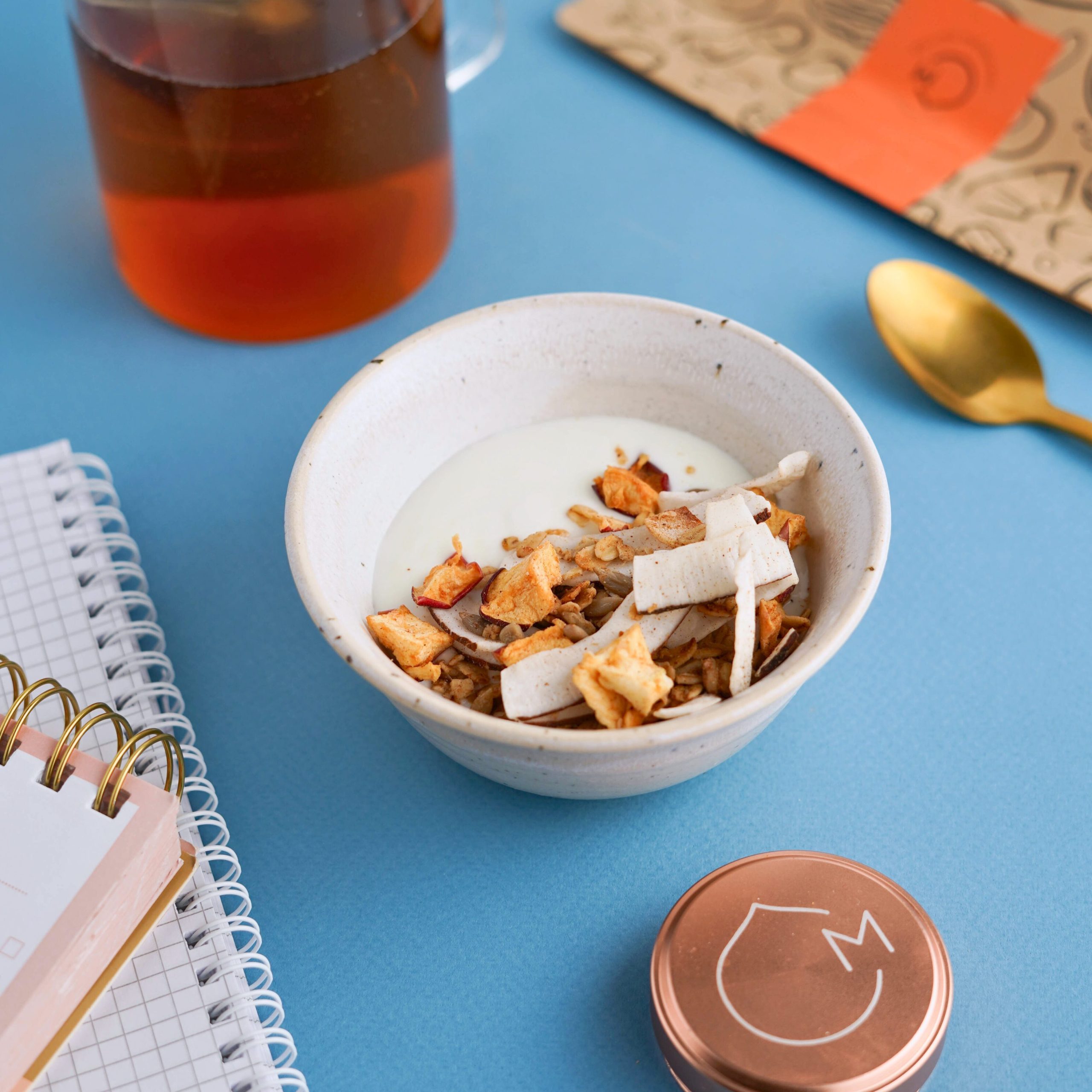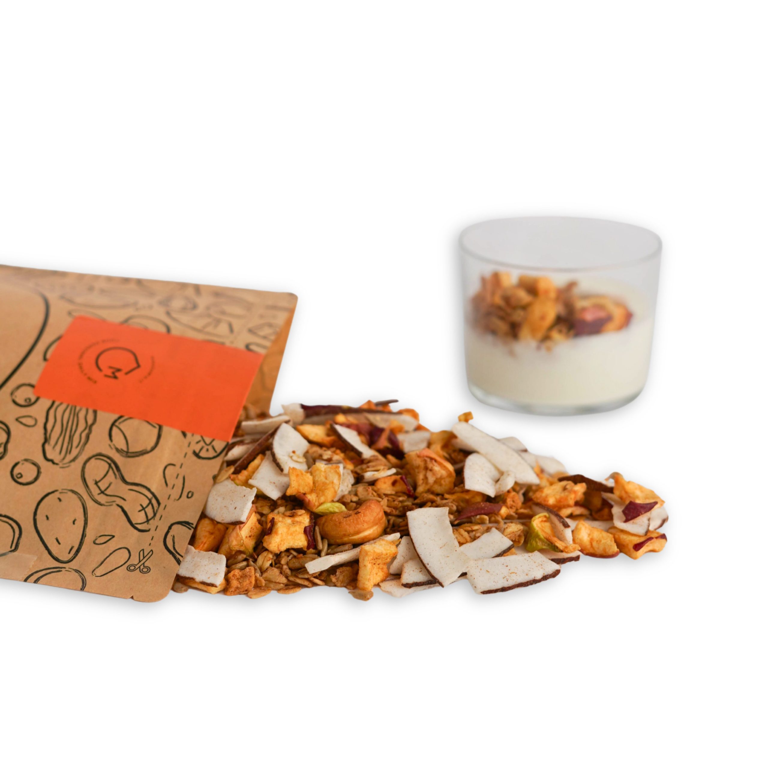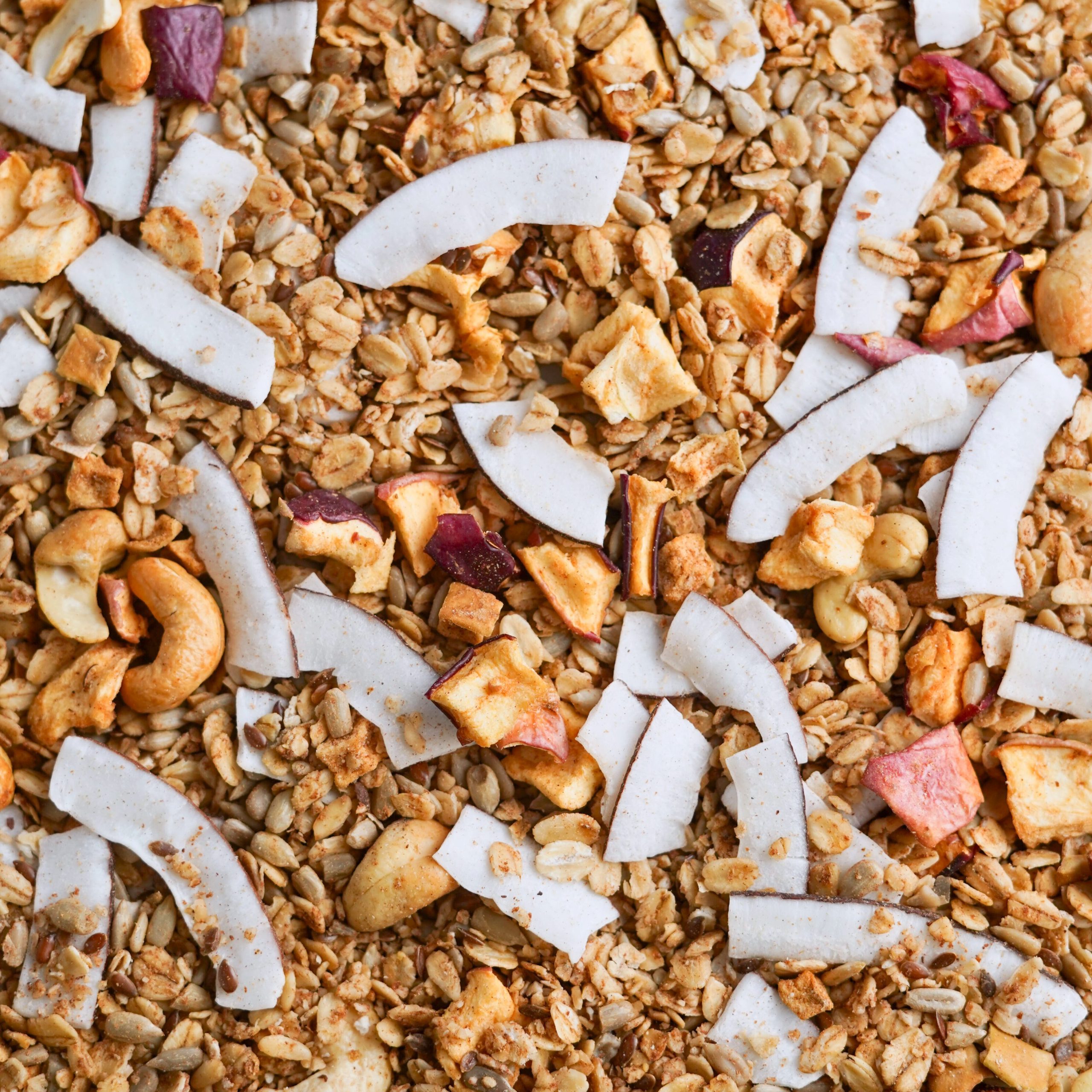 Dentro trovi un mix profumato di cocco, mela essiccata e anacardi, tostati al punto giusto per una consistenza avvolgente e naturale. Una pausa semplice, dal sapore tropicale e autentico.