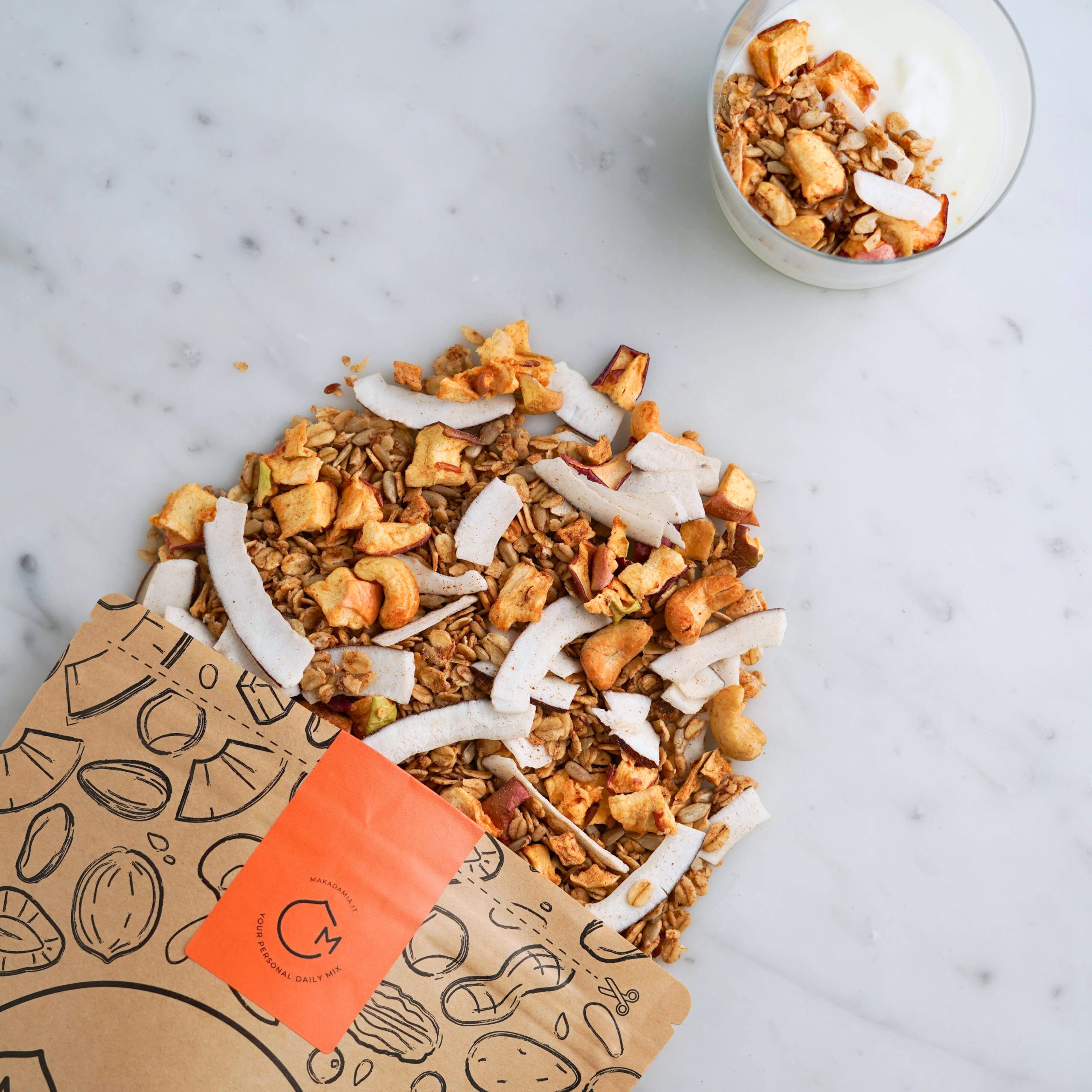 Perfetta con yogurt, latte o bevande vegetali, oppure da sgranocchiare da sola quando vuoi uno snack con pochissimi zuccheri, ma con tutto il gusto Makadamia.