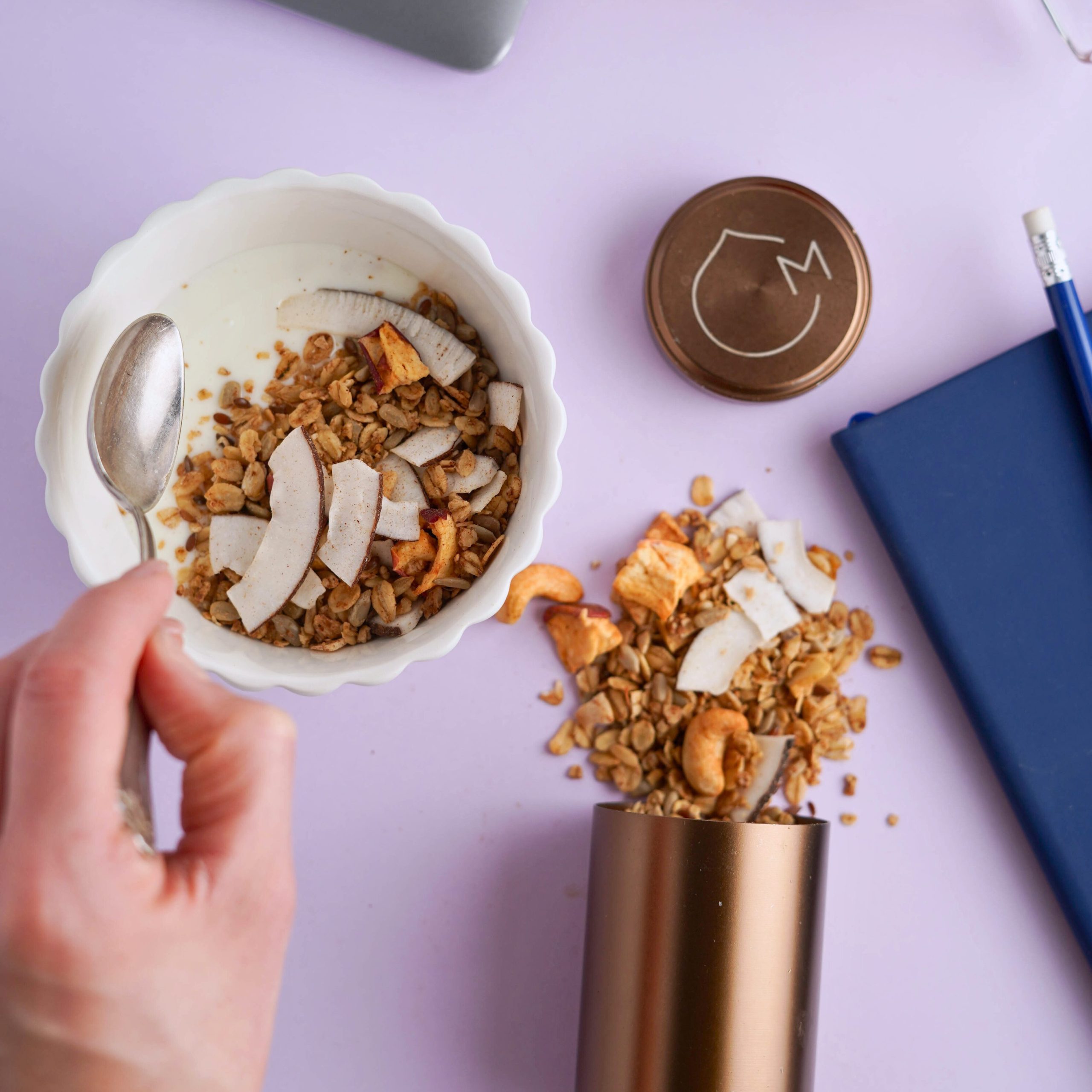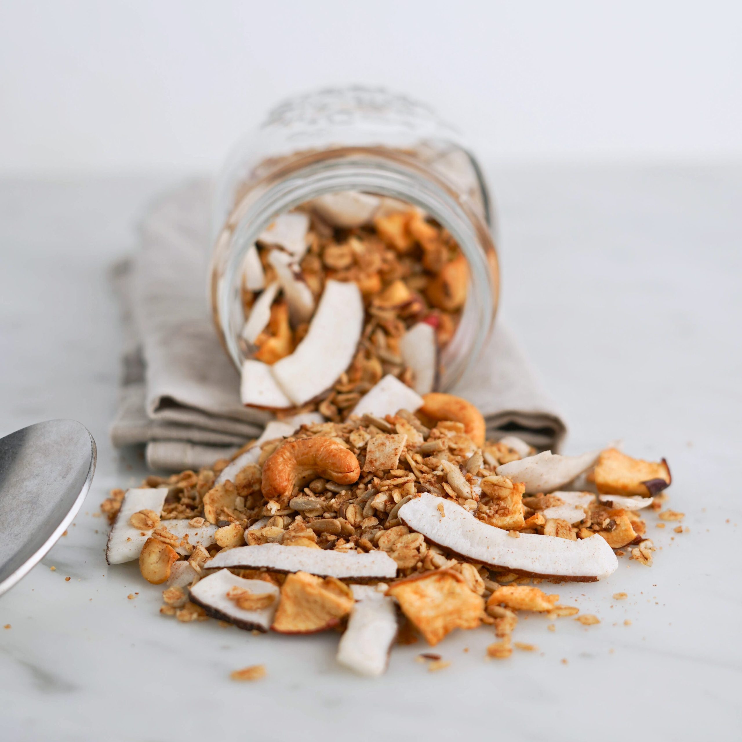 Questa ricetta contiene solo il 5% di zuccheri: è pensata per far assaporare una granola gustosa e croccante, ma adatta a chi sta cercando di ridurre gli zuccheri nella quotidianità, senza rinunciare al piacere.