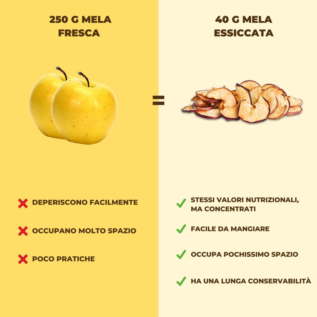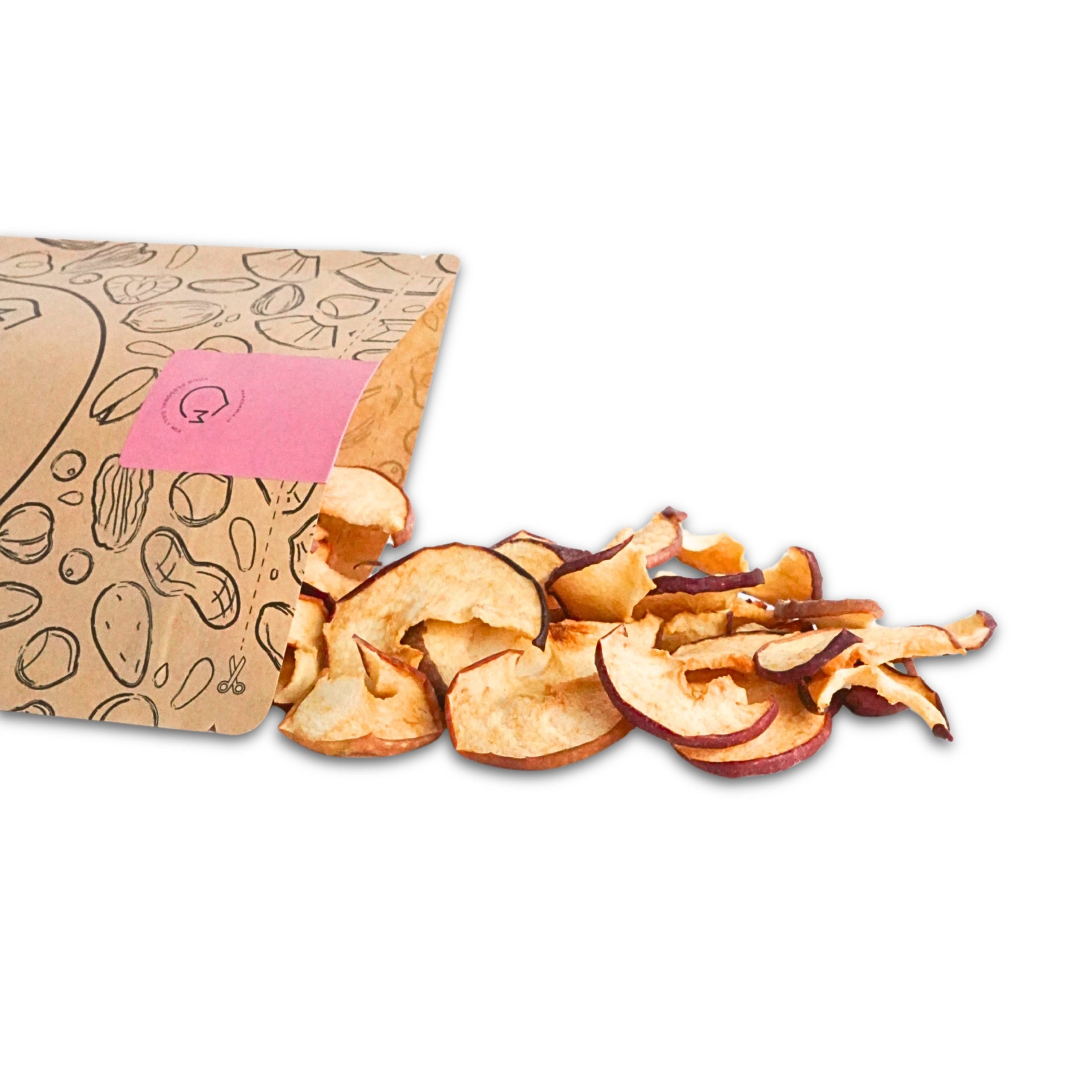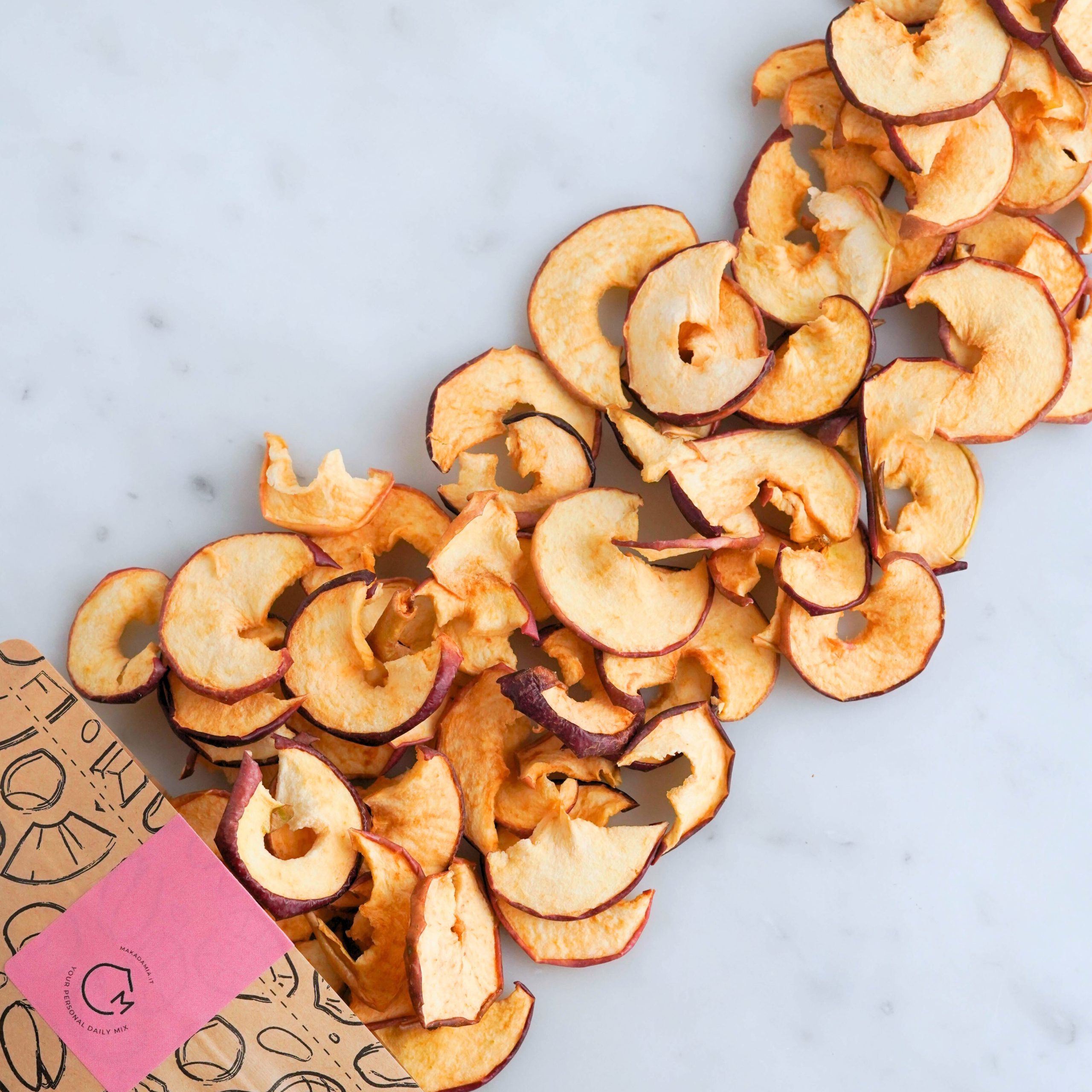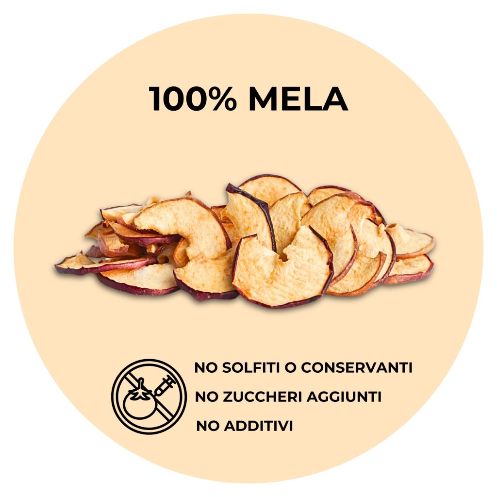 A differenza delle classiche chips croccanti, qui la mela resta morbida, dolce e avvolgente. L’essiccazione lenta a basse temperature e la buccia intatta regalano un sapore più ricco, quasi “appena colto”, e una consistenza che conquista al primo morso.