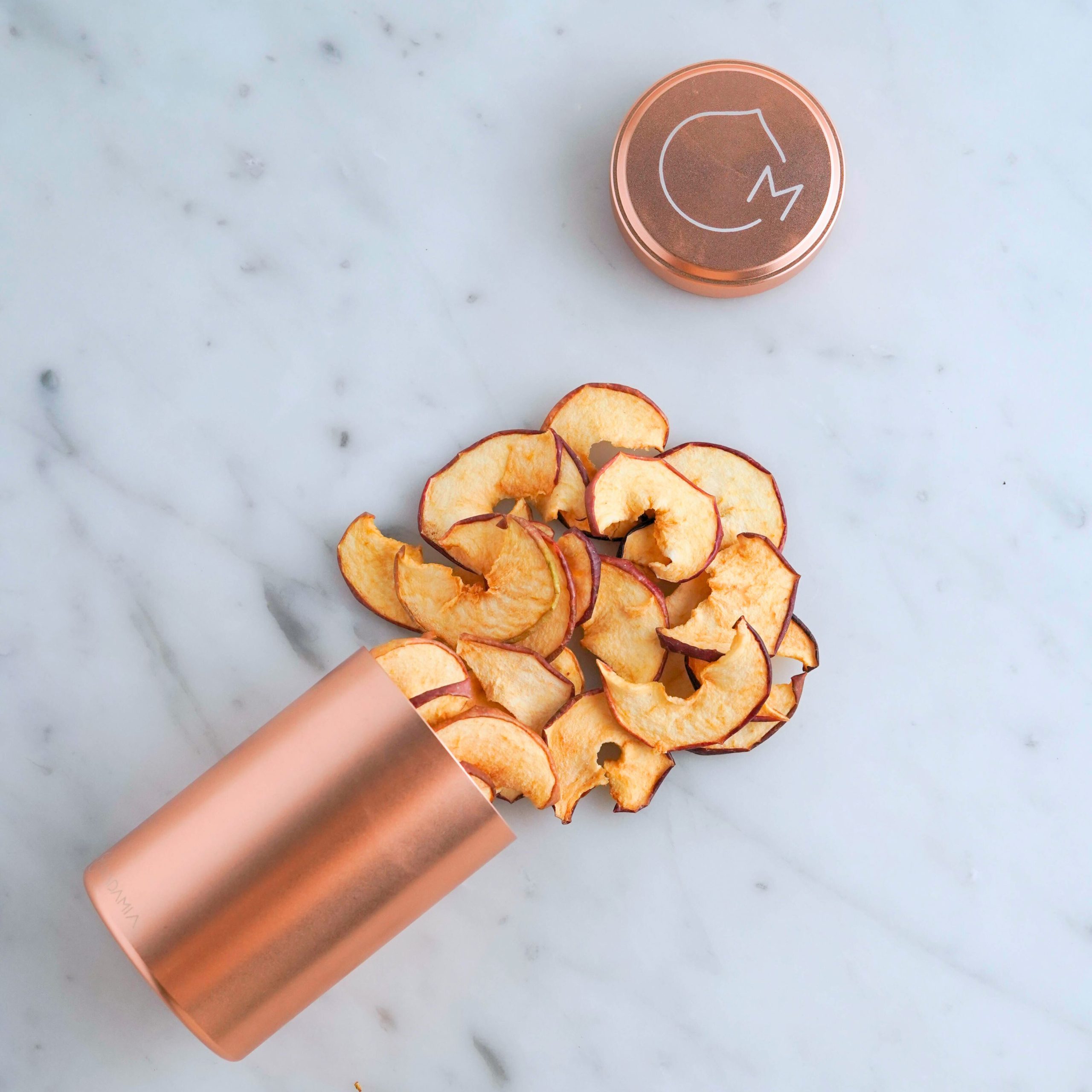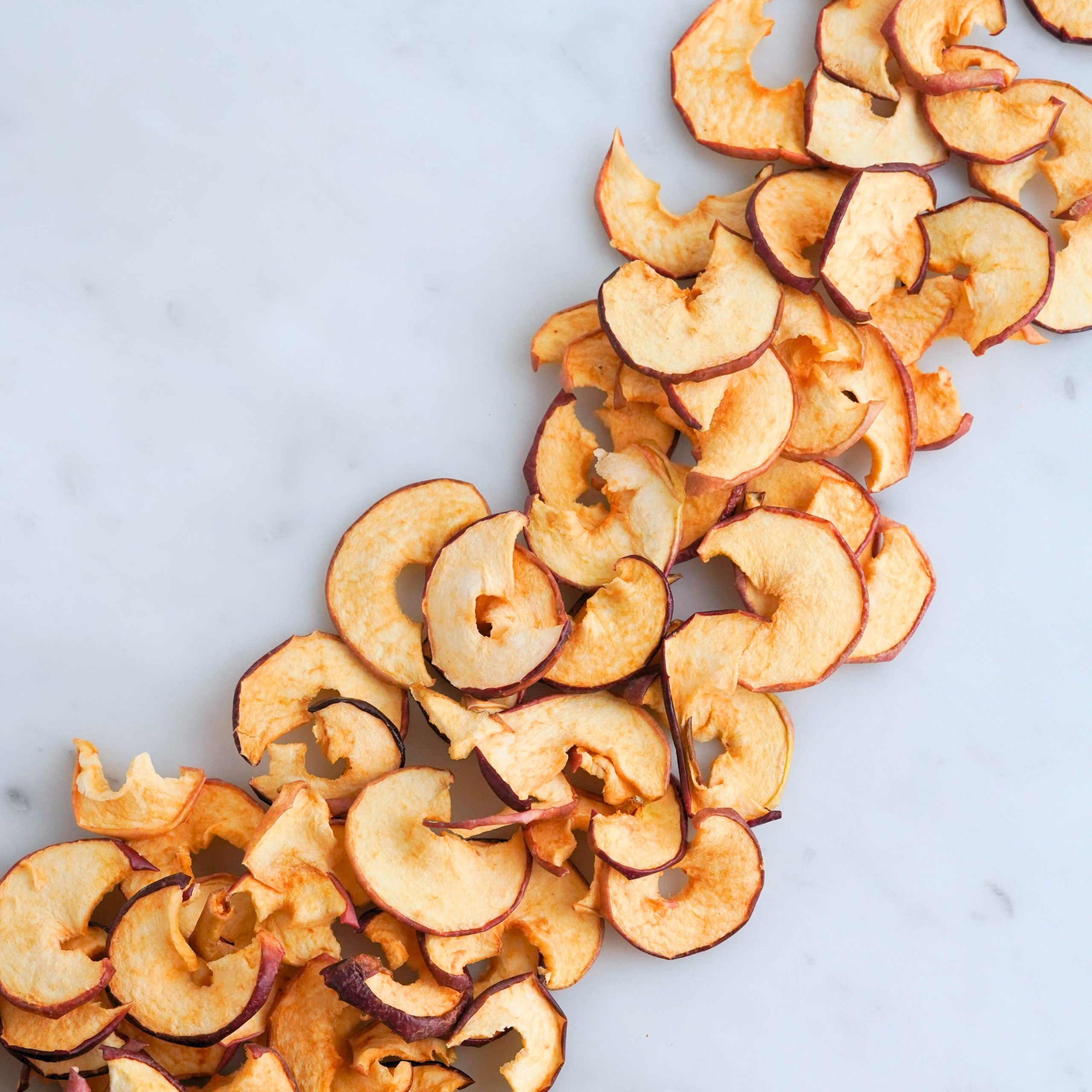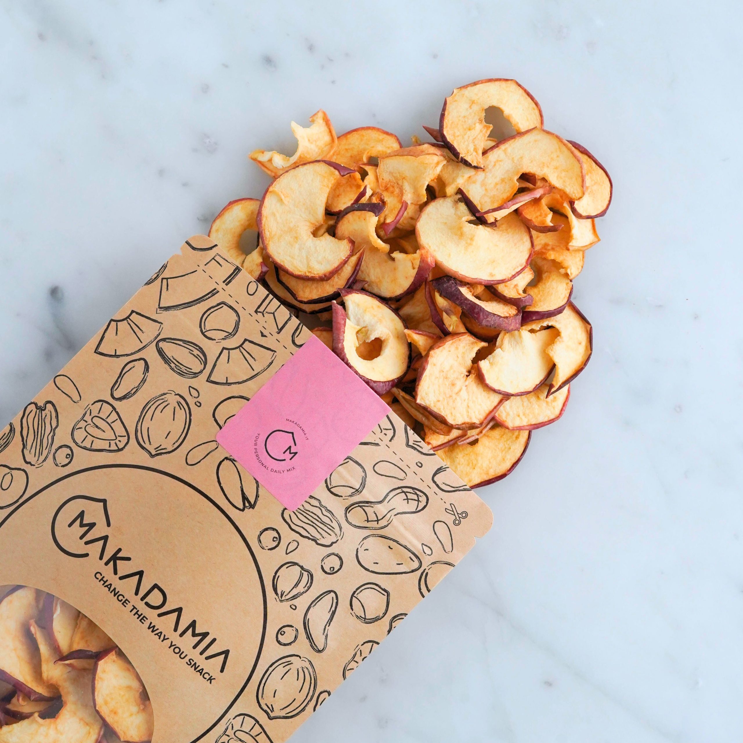 A differenza delle classiche chips croccanti, qui la mela resta morbida, dolce e avvolgente. L’essiccazione lenta a basse temperature e la buccia intatta regalano un sapore più ricco, quasi “appena colto”, e una consistenza che conquista al primo morso.