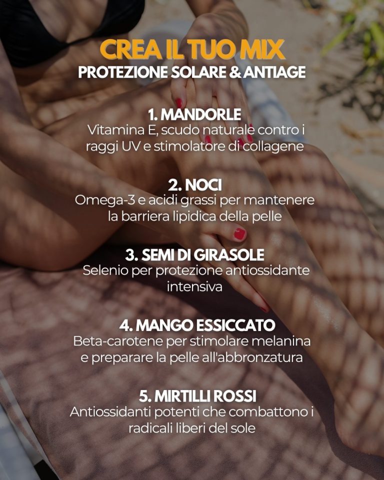 Questa categoria raggruppa gli ingredienti che agiscono come scudo naturale contro i raggi UV. Le mandorle e i semi di girasole sono ricchissimi di vitamina E, il più potente antiossidante per la pelle, mentre le noci forniscono omega-3 che mantengono la barriera lipidica cutanea. Il mango disidratato apporta beta-carotene, che stimola la produzione di melanina per un’abbronzatura sana, e i mirtilli rossi combattono i radicali liberi del sole.