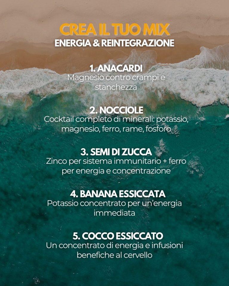 Questi ingredienti sono perfetti dopo una nuotata o una partita a beach volley. Gli anacardi forniscono magnesio contro i crampi muscolari, mentre le nocciole sono un concentrato di sali minerali. La banana disidratata è ricchissima di potassio per reintegrare quello perso con la sudorazione, e il cocco offre elettroliti naturali come una bevanda sportiva, ma in versione solid.