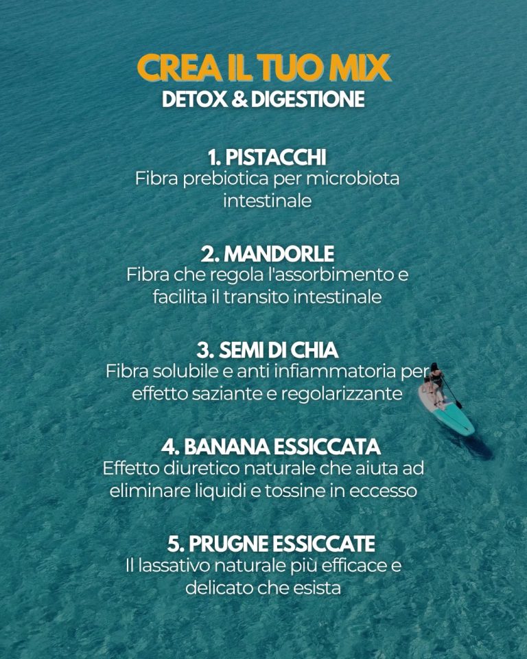 Le vacanze spesso portano a qualche eccesso alimentare. Questo mix aiuta il corpo a “resettarsi” naturalmente. I pistacchi e le mandorle forniscono fibra prebiotica che nutre la flora intestinale, i semi di chia formano un gel che facilita il transito, l’ananas contiene bromelina che aiuta la digestione delle proteine, e le prugne sono il lassativo naturale più delicato ed efficace.